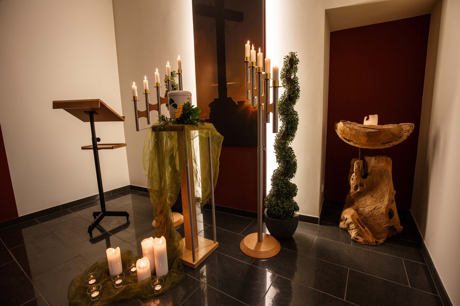 Auch ist es möglich eine Trauerfeier, ob mit Sarg oder Urne, in unseren Räumlichkeiten durchzuführen.